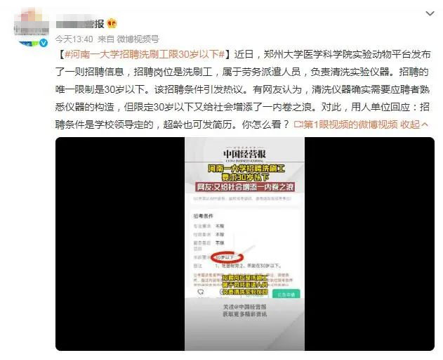 事情的起因是,鄭州大學(xué)醫(yī)學(xué)科學(xué)院實(shí)驗(yàn)動(dòng)物平臺(tái)發(fā)布了一則招聘信息,招聘崗位是洗刷工,屬于勞務(wù)派遣人員,負(fù)責(zé)清洗實(shí)驗(yàn)儀器。招聘的限制是30歲以下。消息一出,引發(fā)網(wǎng)友熱議。